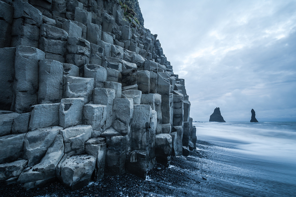 Скала Рейнисфьяр — еще одно украшение пляжа. Она похожа на диковинный водопад, стекающий вниз каменными многогранниками или на окаменевший базальтовый орган, который вот-вот сыграет причудливую мелодию.