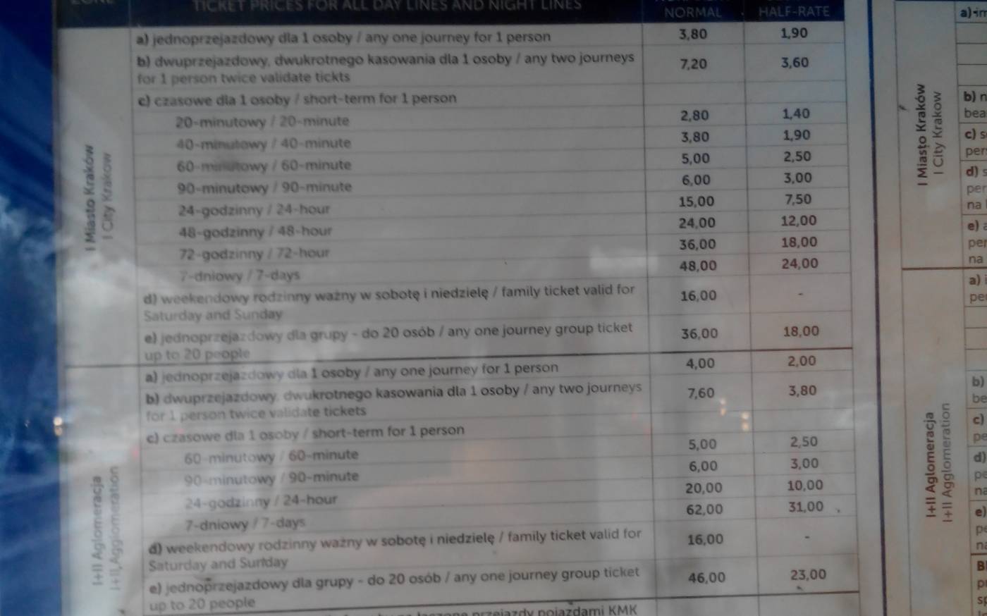 Как правило, перечни цен висят на информационных стендах на остановках, но можно посмотреть и на странице городского транспорта по адресу http://www.mpk.krakow.pl/pl/bilety2/cenniki-biletow-jedno-i-wieloprzejazdowych/