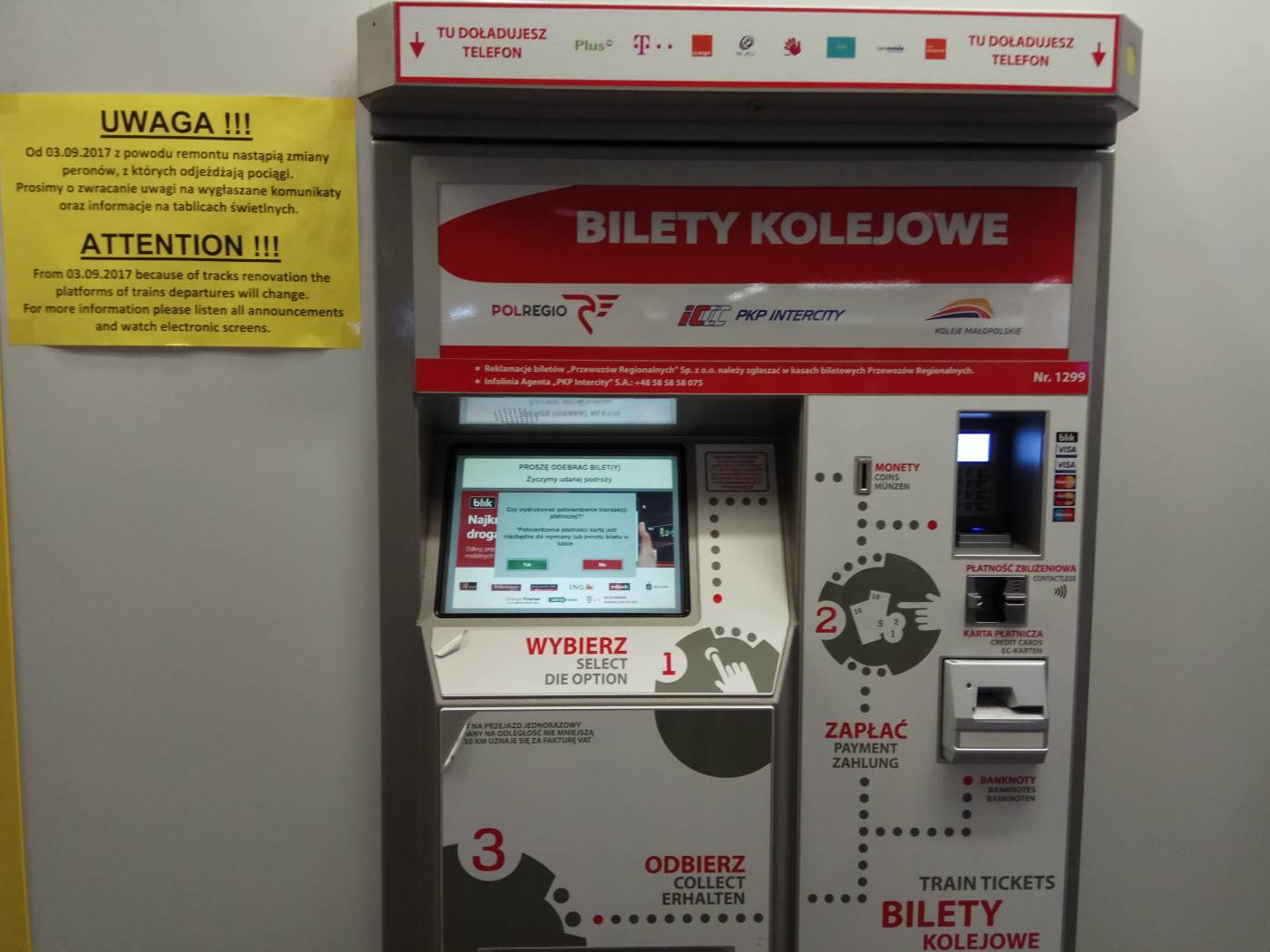 Кроме всего прочего на вокзалах и крупных станциях стоят такие терминалы для покупки билетов (есть англоязычный интерфейс), которые принимают к оплате бумажные банкноты, мелочь, и банковские карты. Так же в таких терминалах можно пополнить и счет на мобильном. С терминалом всё просто: выбираете станцию отправления и станцию прибытия, приблизительное время и дату отправления, количество персон, тариф, вносите оплату. Терминал выдаст вам сам билет и квитанцию об оплате.