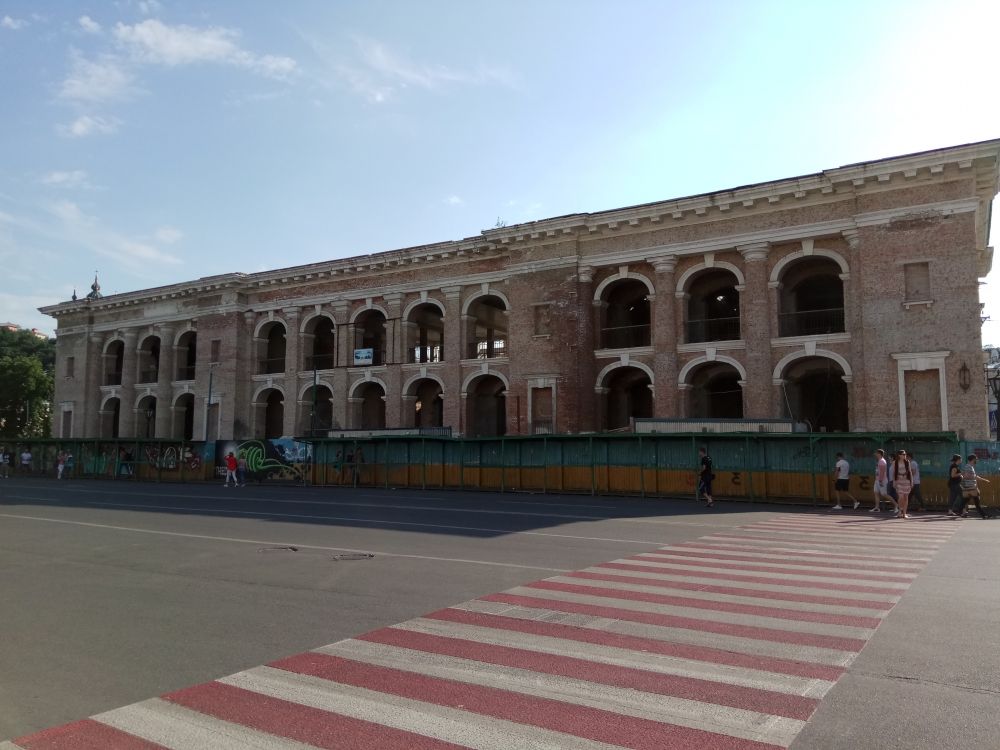 Прямоугольное здание торговых рядов, складов и постоялого двора в центре Контрактовой площади арх. Луиджи Руской спроектировал двухэтажным, однако из-за пожара 1811 г. он смог возвести только первый этаж. Довести строительство до конца смогли только через 25 лет. Рядом находится фонтан «Самсон» (1749 г.), являвшийся частью первого киевского водопровода. В середине XIX в. павильон дополнила наивная скульптурная композиция «Самсон, разрывающий пасть льва» (оригинал хранится в Национальном художественном музее). Над колоннами размещены солнечные часы, над куполом - фигура апостола Андрея.