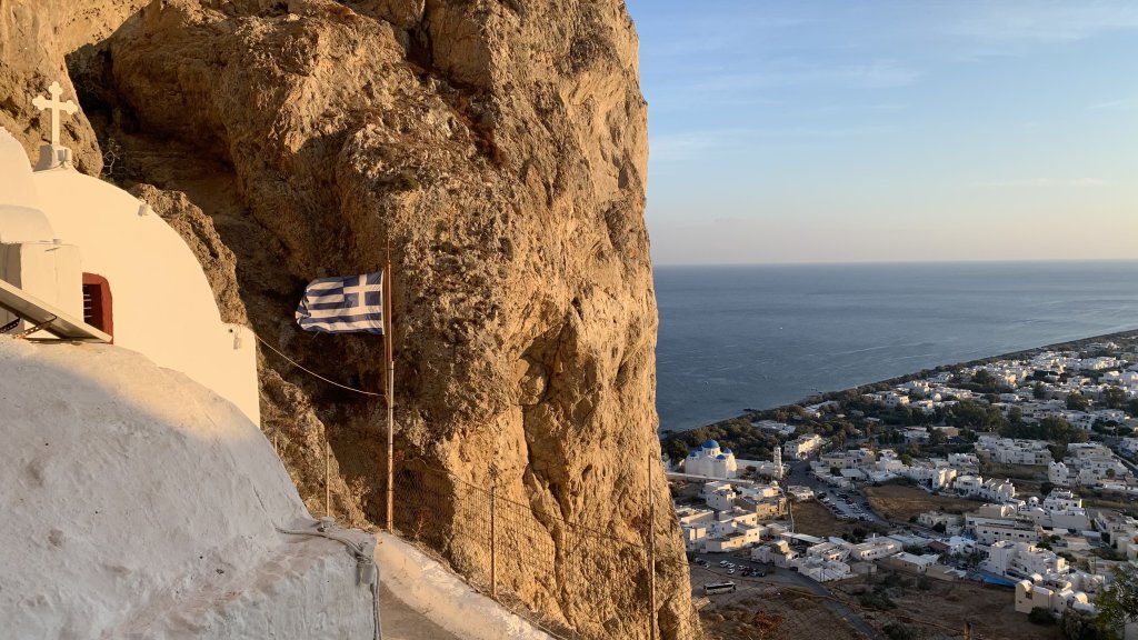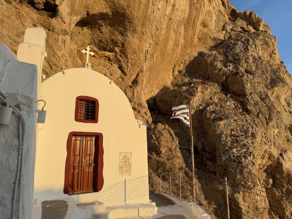 Часовня Панагия Катефиани расположена на склоне горы Меса Вуно, прямо над деревней Перисса на Санторини. Она небольшая и простая по архитектуре — белое здание с арочным входом, построенное прямо в скале. Отсюда открывается хороший вид на побережье и пляж Периссы. Добираться до неё можно пешком по тропе, ведущей к Древней Тире. Подъём несложный, но требует удобной обуви.